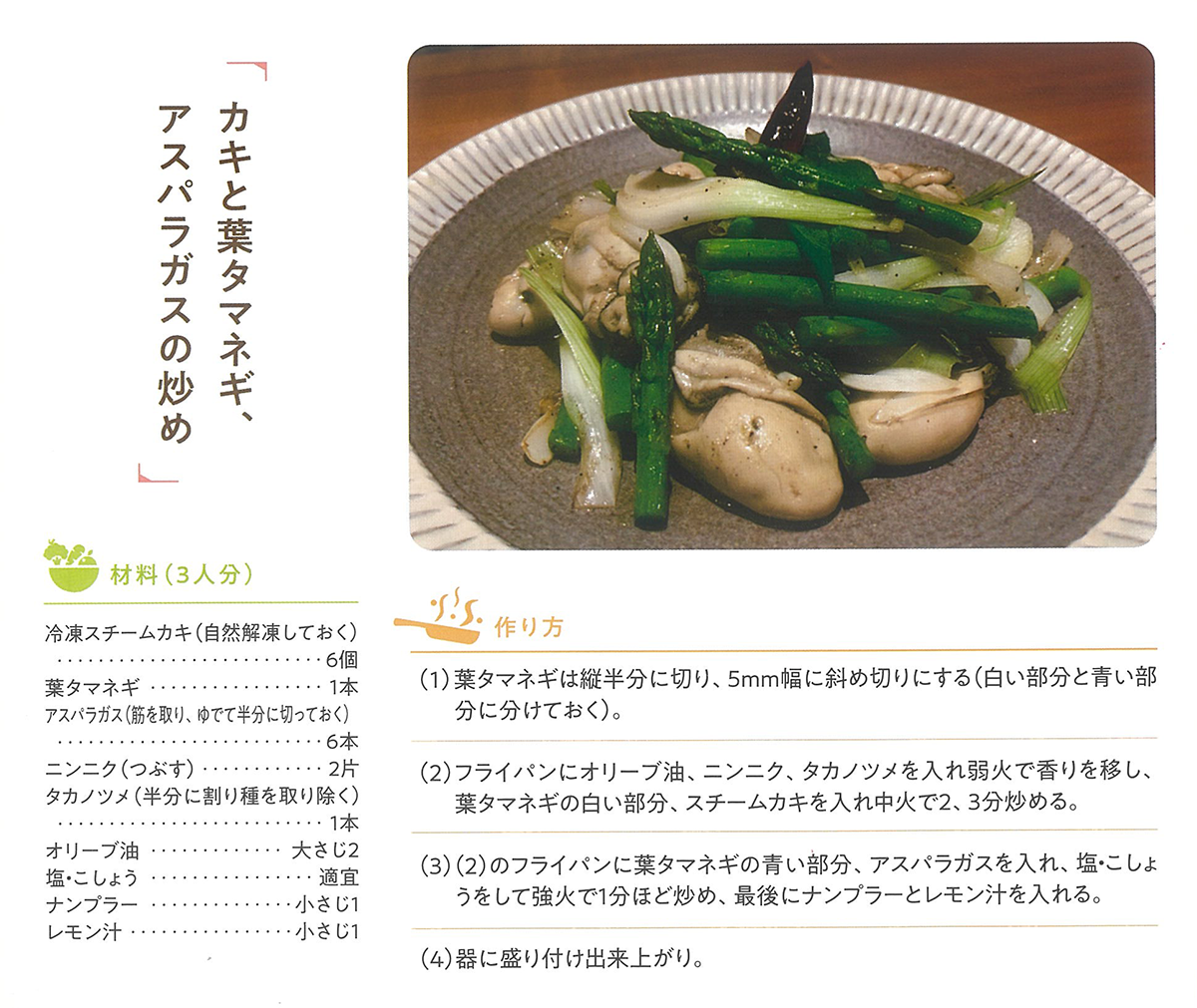 カキと葉タマネギ、アスパラガスの炒め