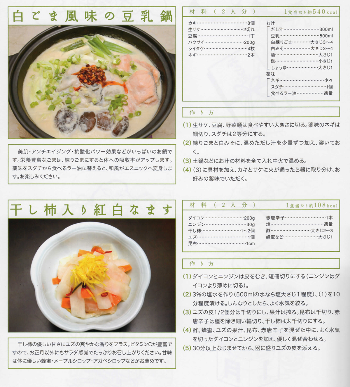 白ごま風味の豆乳鍋と干し柿入り紅白なます