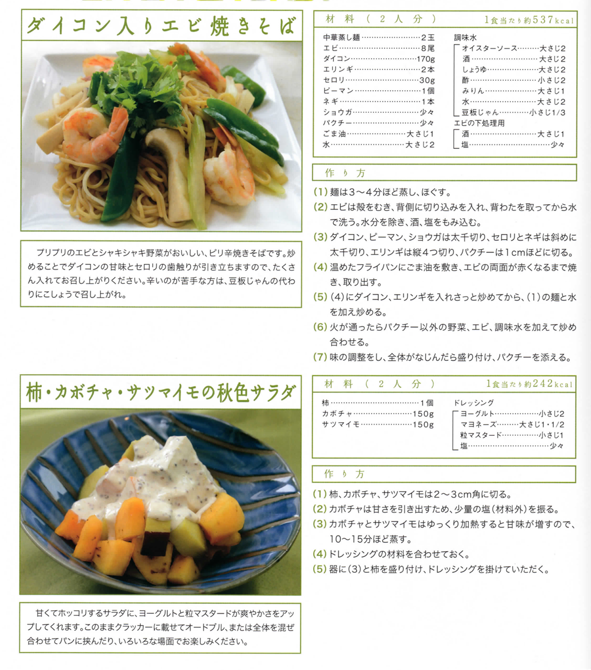 ダイコン入りエビ焼きそばと柿・カボチャ・サツマイモの秋色サラダ