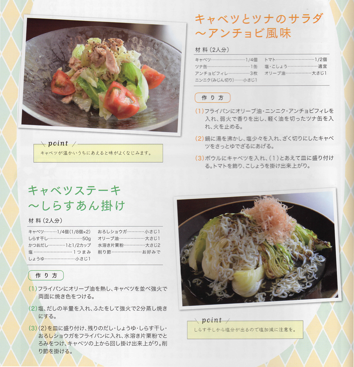 キャベツとツナのサラダ~アンチョビ風味とキャベツステーキ~しらすあん掛け