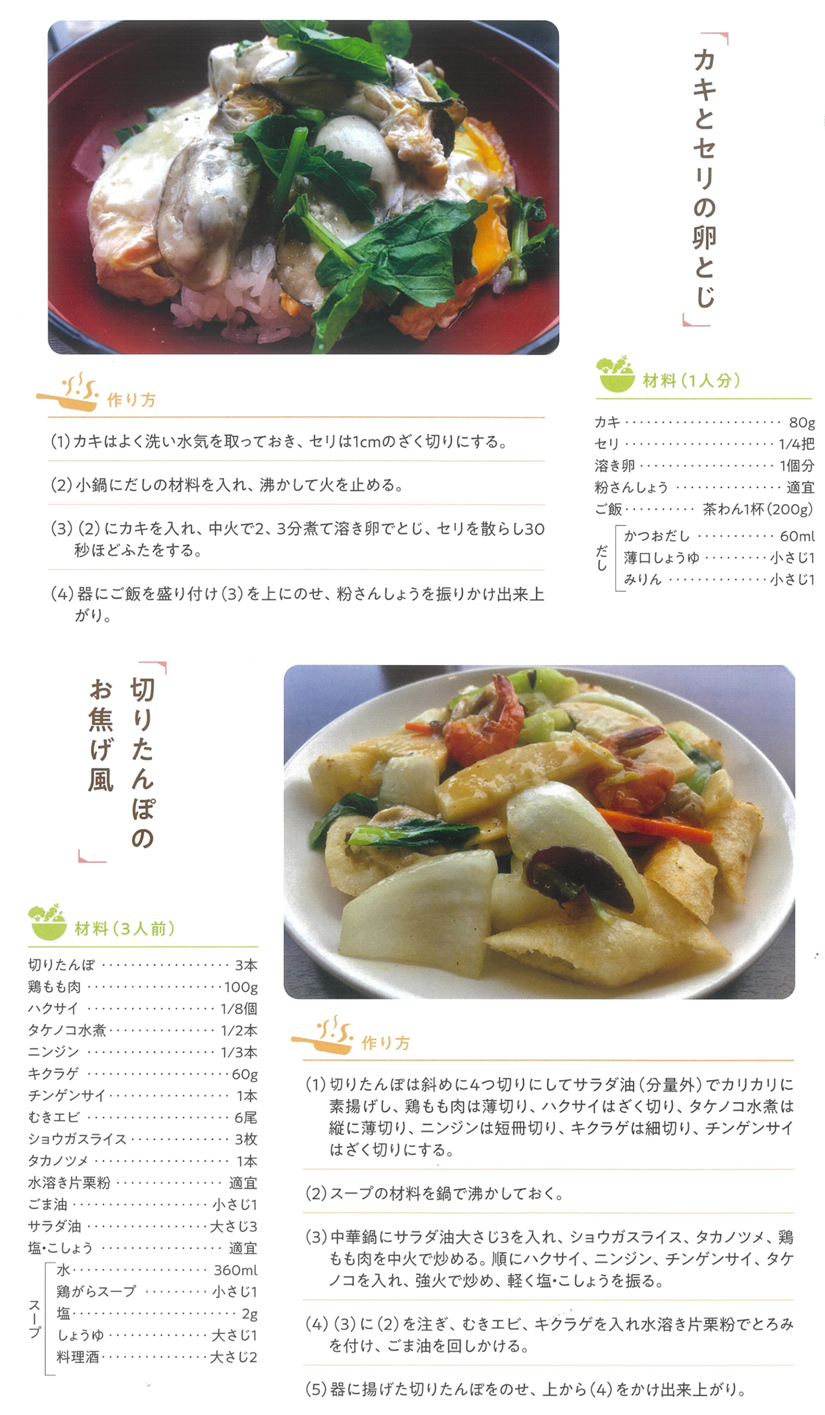 カキとセリの卵とじと切りたんぽのお焦げ風