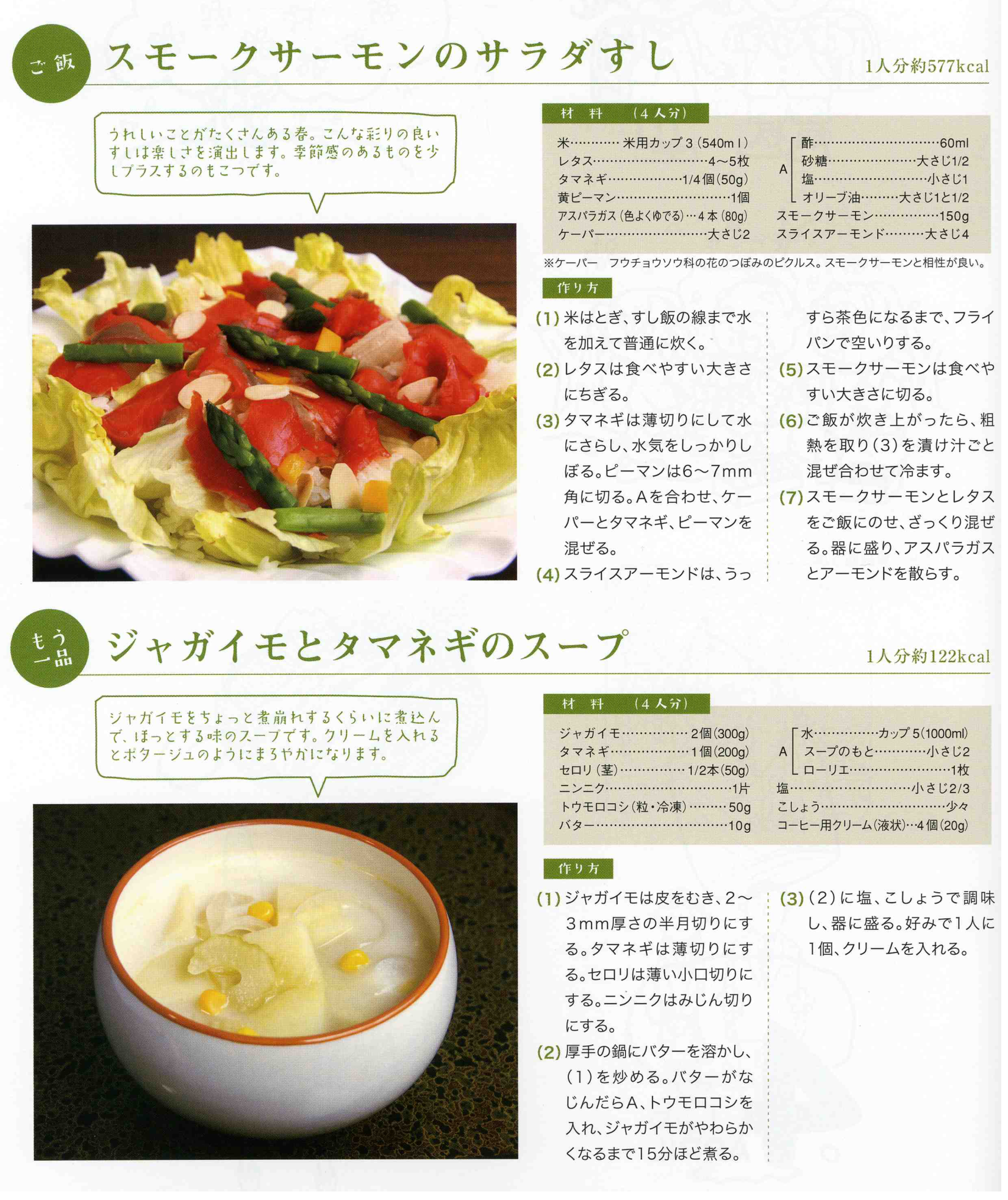 スモークサーモンのサラダすしとジャガイモとタマネギのスープ