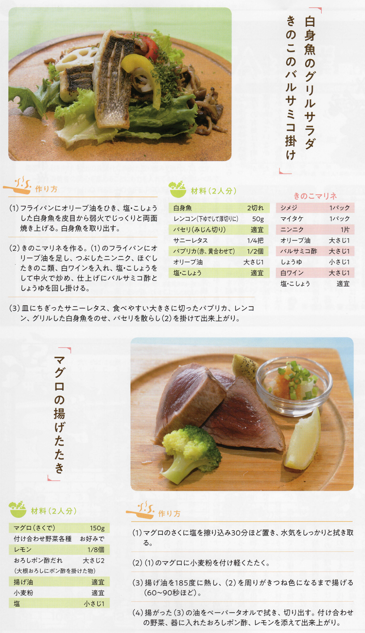 白身魚のグリルサラダきのこのバルサミコ掛けとマグロの揚げたたき