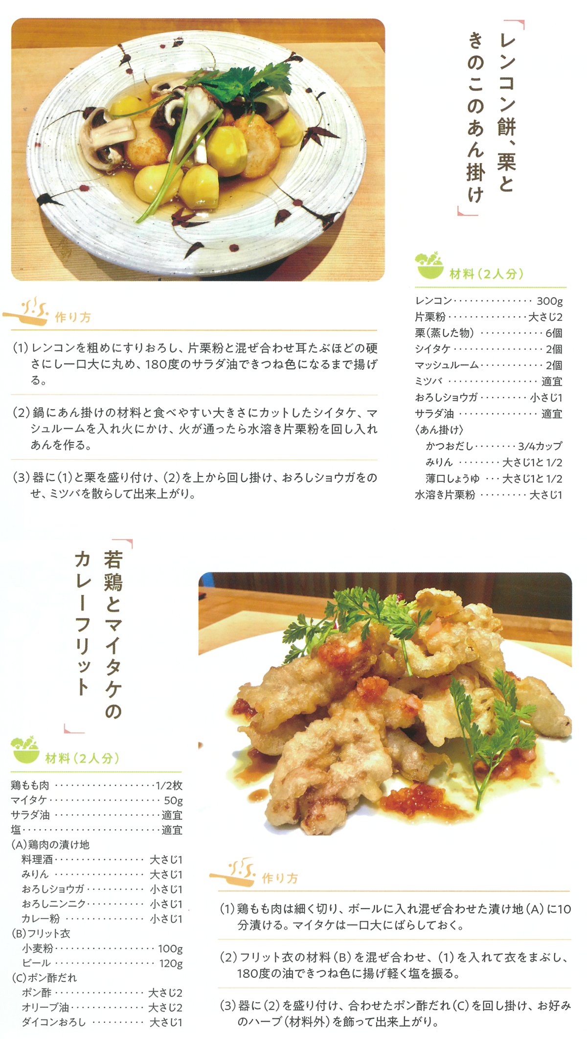 レンコン餅、栗ときのこのあん掛けと若鶏とマイタケのカレーフリット